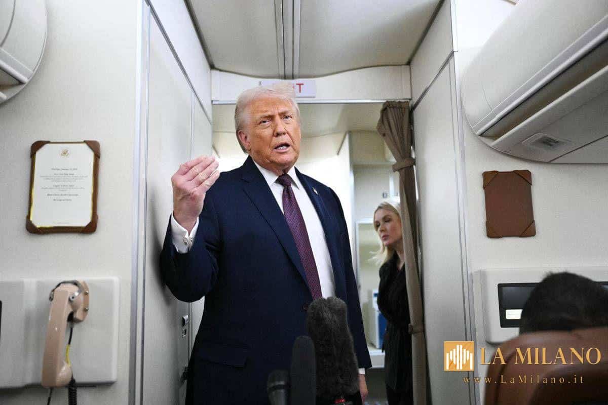Donald Trump a tutto campo sull’Air Force One di ritorno da Davos: dalla Groenlandia all’Ucraina, dal Venezuela all’Iran, fino al Board of Peace.