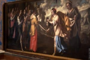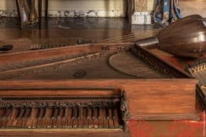 “La prima sala del Museo ospita quadri e strumenti d’epoca provenienti dalla collezione Sambon. La Spinetta del ‘600, realizzata a Napoli da Honofrio Guaracino, stupisce per la decorazione pittorica, mentre la chitarra-lira e l’arpa-liuto colpiscono per la loro bizzarra ambivalenza.