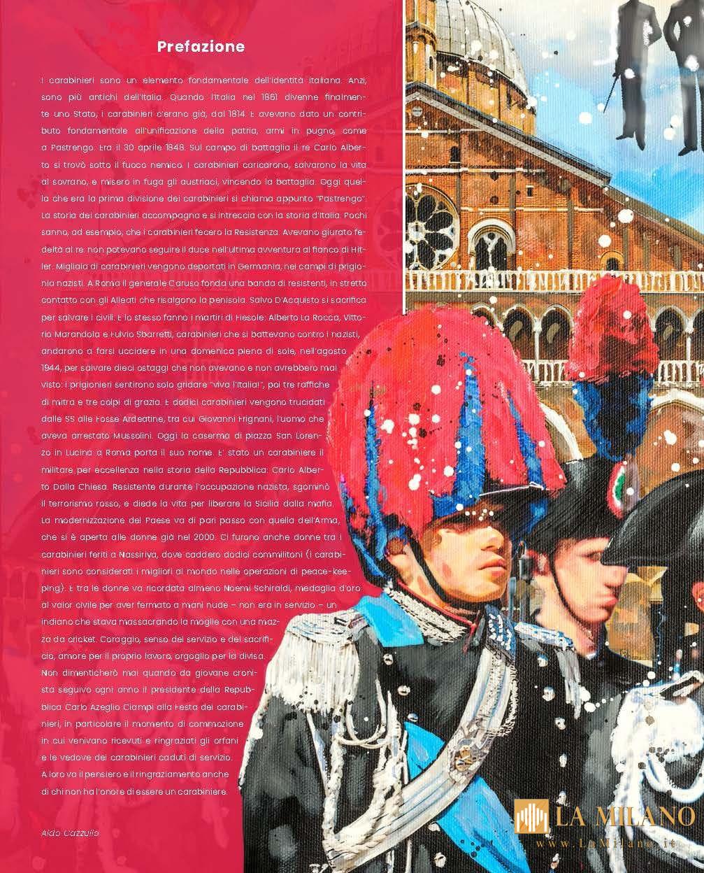 La prefazione di Aldo Cazzullo offre uno sguardo storico e valoriale sull’Arma, ricordando come i Carabinieri, nati nel 1814, abbiano attraversato la storia d’Italia dai moti risorgimentali alla Resistenza, fino alla contemporaneità, incarnando un simbolo di unità nazionale e sacrificio. A loro, e in particolare a chi ha pagato con la vita, è rivolto un commosso ringraziamento.