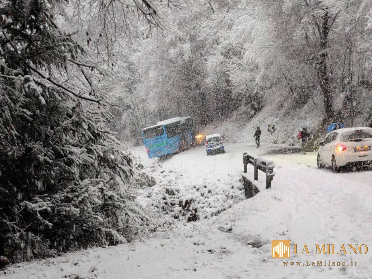 Paura in Valle Serina: un autobus con quaranta studenti a bordo scivola sulla neve e si blocca a pochi metri da una scarpata. Nessun ferito, ma traffico paralizzato e forti disagi in tutta la Lombardia per la nevicata.