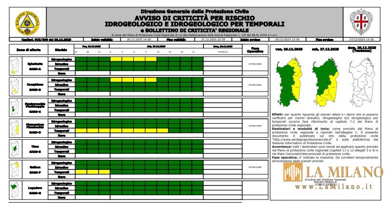 CAGLIARI – La Protezione Civile Regionale ha diramato un’allerta meteo di codice giallo (criticità ordinaria) per rischio idrogeologico che interesserà anche il territorio di Cagliari e l’intera zona del Campidano. L’avviso è valido a partire dalla mezzanotte di oggi, venerdì 26 dicembre 2025, e si estenderà fino alle ore 12:00 di sabato 27 dicembre 2025.