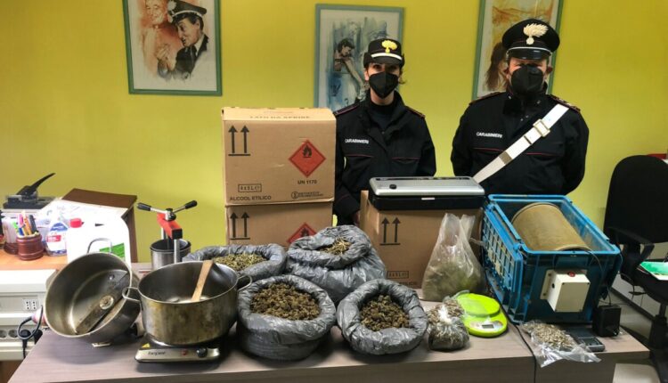 Nella circostanza, alle ore 12:00 circa, durante il previsto controllo i Carabinieri notavano presso l’abitazione di questi la presenza di un noto assuntore di sostanze stupefacenti e, per tale motivo decidevano di effettuare il controllo dell’abitazione del 63enne. All’esito del controllo veniva rinvenuto un vero e proprio laboratorio per la produzione di hashish, infatti erano presenti: