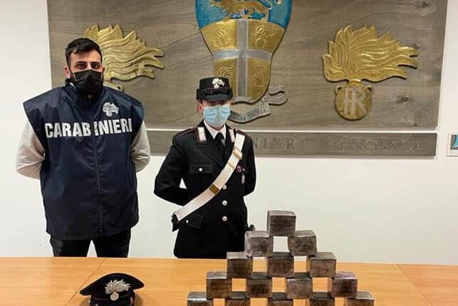A seguito di perquisizione personale e veicolare, i carabinieri hanno rinvenuto 100 panetti di hashish del peso complessivo di 10 kg., abilmente occultati in un doppio fondo dell’auto.
