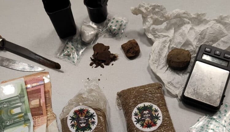 La perquisizione dei locali effettuata con il cane antidroga Leone ha permesso di sequestrare 210.79 grammi tra hashish e marijuana e 0.46 grammi di cocaina suddivisi e nascosti in diversi punti della casa, oltre che 160 euro, materiale da confezionamento e bilancia di precisione.