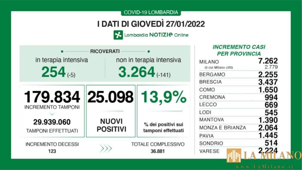 Coronavirus in Lombardia, i dati di giovedì 27 gennaio 2022
