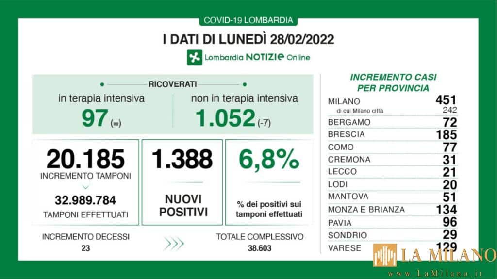 Coronavirus in Lombardia, i dati di lunedì 28 gennaio 2022