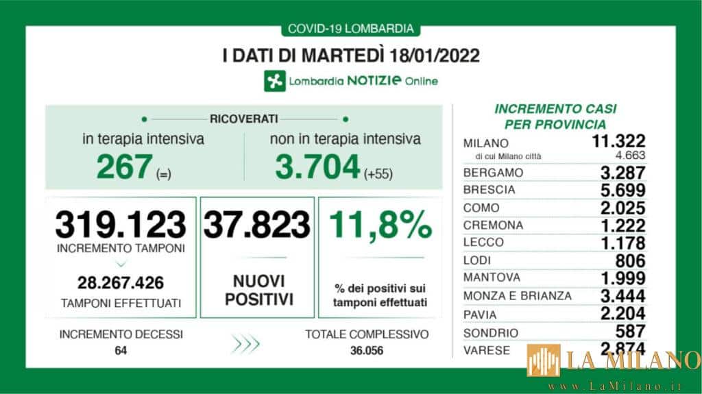 Lombardia, a fronte di 319.123 tamponi effettuati, sono 37.823 i nuovi positivi (11,8%).