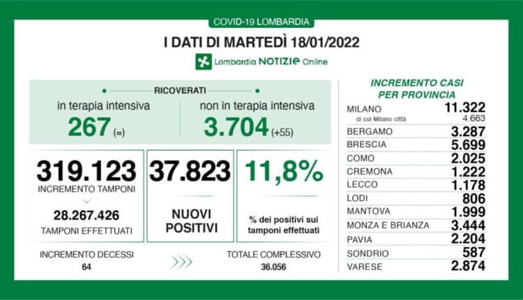 Lombardia, a fronte di 319.123 tamponi effettuati, sono 37.823 i nuovi positivi (11,8%).