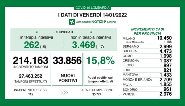 Coronavirus in Lombardia, i dati di venerdì 14 gennaio 2022