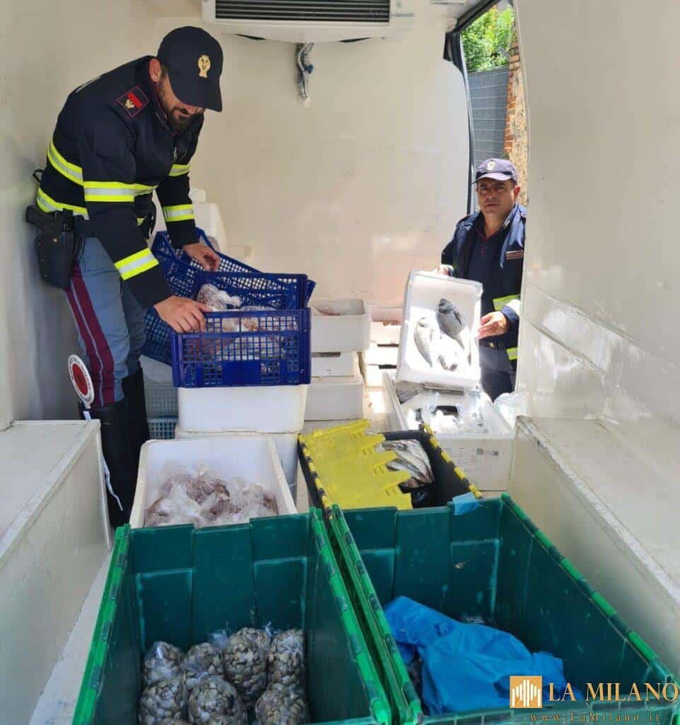 Durante la verifica della documentazione e all’ ispezione del mezzo i poliziotti accertavano che oltre al portellone posteriore rotto, nel vano di trasporto vi erano varie casse contenente pesce, privo di qualsiasi documentazione circa la provenienza ed inoltre il trasporto avveniva con il gruppo frigorifero spento.