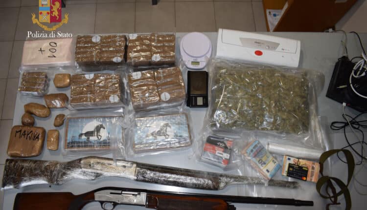 Recuperato oltre un chilo di marijuana, 9 chili di hashish e 5 chili di cocaina insieme con bilancini di precisione e tutto il materiale per il confezionamento della sostanza stupefacente.