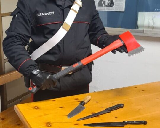 L’ascia, della lunghezza di cm.70 e peso di 1,4 kg acquistata poco prima in un negozio della zona, è stata sequestrata insieme a 5 coltelli da cucina di grosse dimensioni trovati nella sua abitazione a seguito di perquisizione.