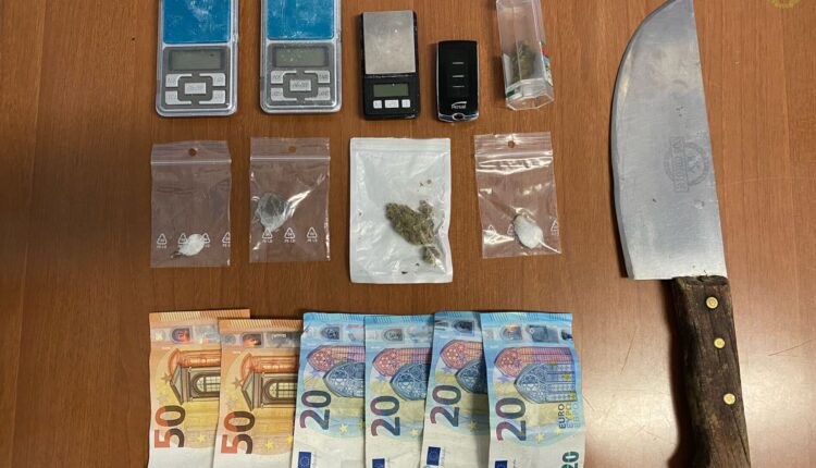 A conferma delle ipotesi investigative, è stato rinvenuto vario materiale utilizzato per il confezionamento di sostanze stupefacenti, nonché diversi bilancini di precisione e, nascosto all’interno dell’armadio, un coltello da macellaio di grosse dimensioni che presumibilmente veniva usato per il taglio della droga.