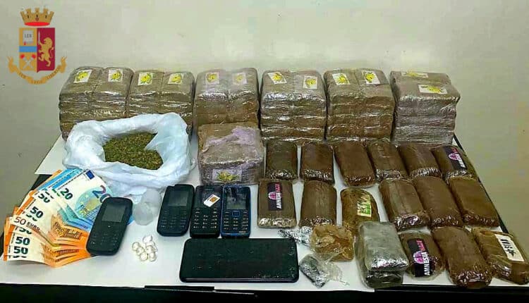 Successivamente sono entrati nel magazzino e, con l’ausilio dell’unità cinofila dell’Ufficio Prevenzione Generale e Soccorso Pubblico, hanno rinvenuto e sequestrato all’interno di un armadio 8 kg e mezzo di hashish, 50 grammi di marijuana e alcune dosi di cocaina.
