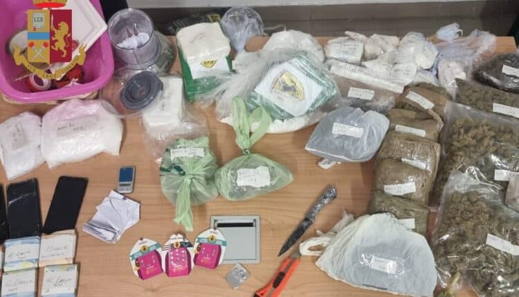Nominalmente intestata a una donna non più residente da tempo, all’interno dell’abitazione sono stati rinvenuti, e sequestrati a carico di ignoti, quattro chili e 434 grammi di cocaina, un chilo e 174 grammi di shaboo, un chilo e 79 grammi di hashish, 19 chili e 61 grammi di marijuana, 5.300 euro in banconote da piccolo taglio, una pressa da officina con carico da 75 tonnellate completa da forme modello di diverso calibro, buste per confezionamento, bilancini di precisione e un frullatore per la preparazione dello stupefacente.
