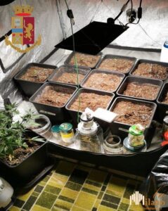 A seguito di perquisizione domiciliare, effettuata con l’ausilio dell’unità cinofila dell’Ufficio Prevenzione Generale della Questura, gli agenti hanno rinvenuto e sequestrato, all’interno della camera da letto, una serra adibita alla coltivazione di piante con 12 vasi di piante di marijuana, lampade a led, umidificatore, fertilizzante e un sistema di areazione elettronico, 7 barattoli contenente marijuana per un totale di 89.45 gr, materiale per il confezionamento, bilancino di precisione, 2 coltelli utilizzati per tagliare la droga e 540 euro in contanti.