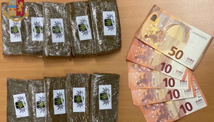 A seguito della perquisizione è stato trovato in possesso di 10 panetti di sostanza stupefacente di tipo hashish (riportante etichetta con dicitura TOP) per un peso complessivo di 1 kg e di 90 euro in banconote di diverso taglio.