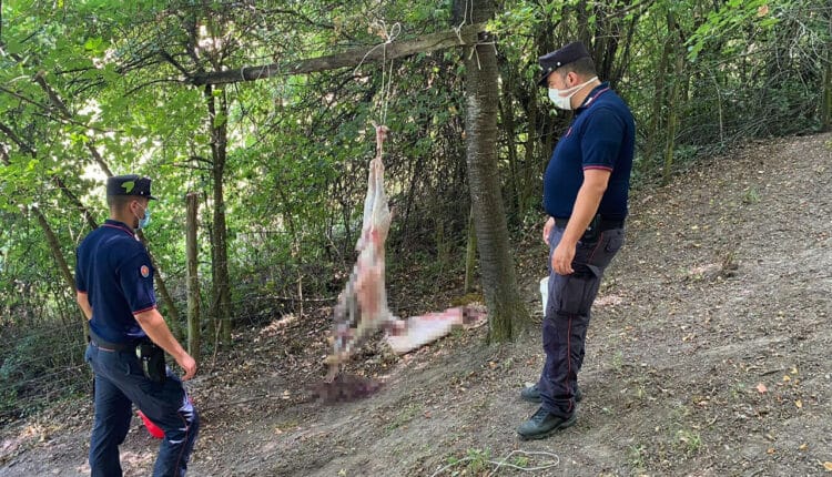 Richiesto l’ausilio dei Veterinari dell’AUSL di Bologna, i militari hanno potuto constatare l’uccisione di alcuni agnelli mediante sgozzamento e senza il preventivo stordimento di cui, uno già scuoiato ed eviscerato riposto in un sacco di plastica in attesa di essere trasportato e uno appena ucciso trovato appeso ad una trave posta tra la vegetazione. Sul posto i militari hanno rinvenuto anche sacchi di plastica contenenti interiora e le teste degli animali crudelmente uccisi oltre a diverse chiazze e tracce di sangue non ancora rappreso a dimostrazione dell’illecita pratica.