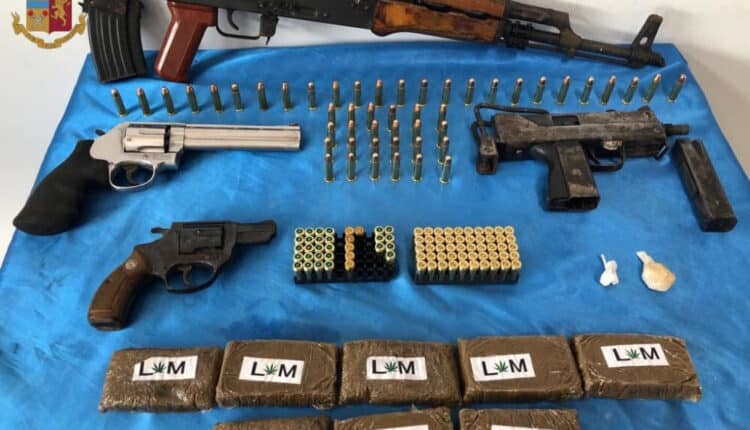 Le armi sono un fucile mitragliatore d’assalto AK47 Kalashnikov, una pistola mitragliatrice Ingram M11 cal. 9, due pistole a tamburo di cui una Smith e Wesson cal. 357 Magnum e l’altra Astracal cal. 38, 135 cartucce di diverso calibro, 8 panetti di hashish del peso complessivo di 800 grammi circa, un involucro contenente 5 grammi di cocaina e un sacchetto con sostanza da “taglio”.