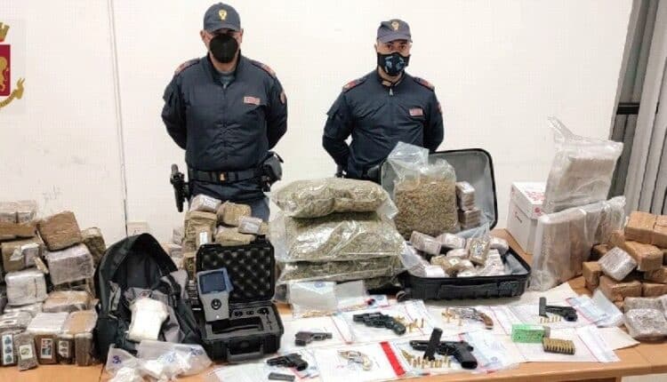 I poliziotti l’hanno raggiunto e bloccato e, una volta entrati nel locale in uso all’uomo, hanno rinvenuto, all’interno di due grandi cassonetti usati per la raccolta di rifiuti, 85 panetti di hashish del peso di circa 70 kg, 40 panetti della stessa sostanza per un peso di circa 32 kg custoditi in una borsa per le consegne a domicilio e altri 8 kg in un trolley, 745 grammi circa di cocaina in uno zaino, 4 buste contenenti 4,2 kg di marijuana conservate all’interno di un frigorifero a pozzetto e diverso materiale per il confezionamento della droga.