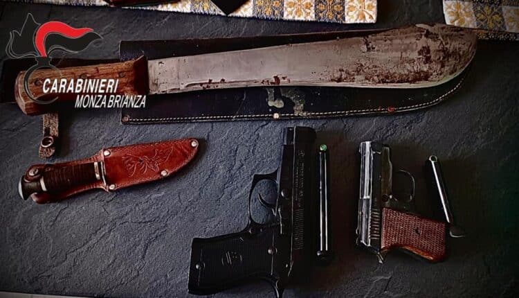 Nel frattempo sono sopraggiunti a sirene spiegate i carabinieri della stazione di Besana in Brianza che, appresa la situazione, hanno identificato tutti i presenti, raccolto le testimonianze e hanno perquisito l’abitazione del 56enne trovandolo in possesso di un machete di cm 40, due coltelli a serramanico di cm 30 e cm 15 e due pistole di colore nero, rivelatesi delle scacciacani ma prive del caratteristico tappo rosso sul vivo di volata, identificativo degli strumenti riproducenti armi (non atti a lanciare proiettili).