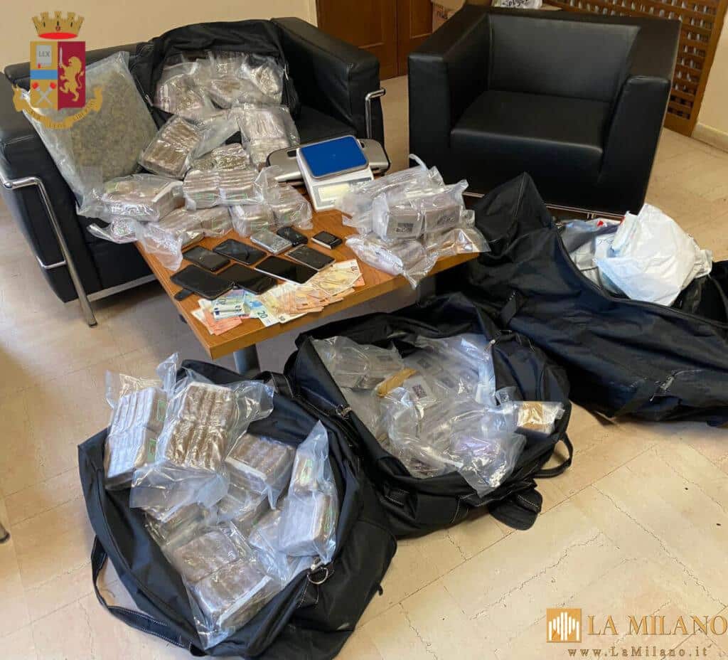Inoltre sono trati rinvenuti 9,820 Kg di marijuana suddivisa in 7 buste sigillate e diversi cellulari, 2 bilancini di precisione, 1 tagliacarte avente lama di cm 11.5e manico di plastica e gomma di cm 13.5 intriso di sostanza stupefacente; 1 coltello in manico di gomma di cm 11.5 e lama di ceramica di cm 11.5 intriso di sostanza stupefacente