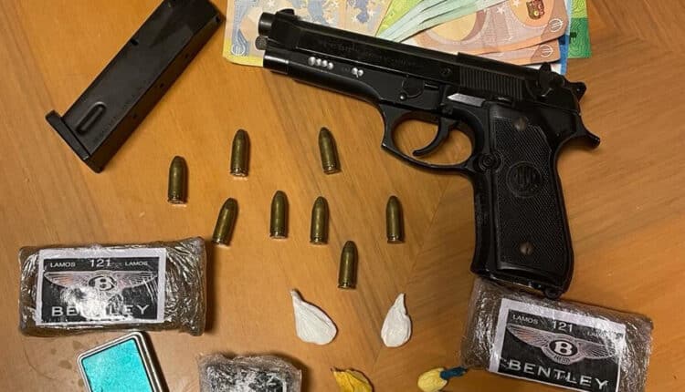 Gli investigatori hanno anche scoperto, nell’appartamento, una pistola Beretta 9/21 con matricola abrasa e munizionamento. Oltre all’arma detenuta illegalmente e al materiale atto al confezionamento sono stati sequestrati circa 400 grammi di hashish e 1000 euro in contanti.