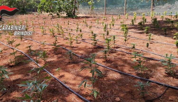 San Vito dei Normanni, i Carabinieri del Nucleo Operativo e Radiomobile hanno eseguito un’ordinanza di custodia emessa dalla sezione del G.I.P. del Tribunale di Brindisi nei confronti di un 38enne di Latiano. L’uomo, lo scorso 20 giugno era stato denunciato in stato di libertà per coltivazione illegale di sostanza stupefacente. In particolare, al termine di un servizio di perlustrazione, in contrada Coltura, agro tra i territori di Latiano, San Vito dei Normanni e Mesagne, il personale operante ha individuato e posto sotto sequestro una piantagione illegale di canapa, allestita nel terreno di proprietà del 38enne, in cui sono state censite 777 esemplari di canapa indiana di altezza compresa fra 10 e 100 cm.. La coltivazione, perfettamente recintata e chiusa dall’esterno, era garantita da un articolato sistema di irrigazione costituito da tubi, rubinetti e gocciolatoi per ogni singola pianta, perfettamente funzionanti. La perquisizione estesa a un trullo ubicato nelle pertinenze ha consentito altresì di rinvenire 204 bicchieri in plastica, all’interno dei quali era stata seminata cannabis, come rilevato dalla presenza di alcune talee già germogliate, due scatole in plastica contenenti semi di canapa in un panno imbevuto d’acqua e un sacco di concime. La coltura indoor in piena funzione, era garantita da un impianto di riscaldamento con timer, costituito da lampade alogene dotate di porta lampada in alluminio, pannelli termo riflettenti in alluminio e da un sistema di ventilazione, costituito da ventilatori elettrici ed un condotto con filtro di areazione. L’arrestato, al termine delle formalità di rito, è stato tradotto presso l’abitazione di residenza in regime di arresti domiciliari.