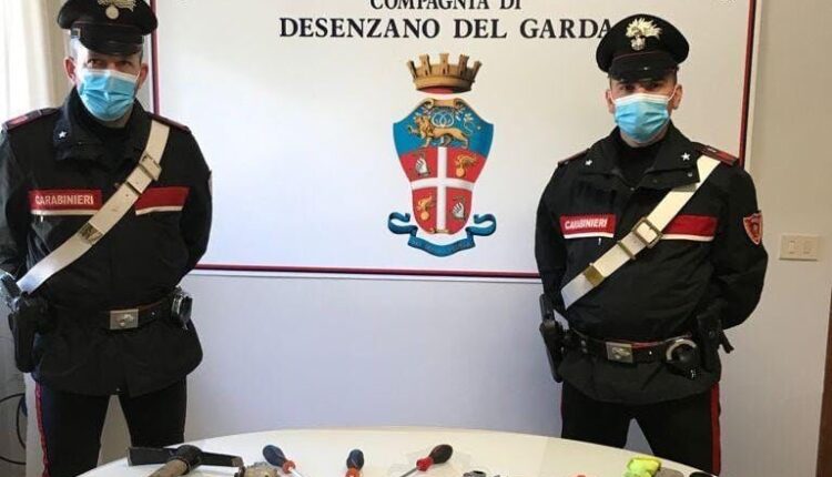 Sirmione, Durante un ordinario controllo del territorio, l’equipaggio dell’Aliquota Radiomobile della Compagnia Carabinieri di Desenzano del Garda, nel transitare in via Comunità Europea di Sirmione, notava un soggetto a piedi vicino ad uno scooter con fare sospetto. Avvicinatisi per sottoporlo al controllo, l’uomo improvvisamente è salito a bordo del motociclo e, dopo averlo acceso repentinamente, ha tentato di dileguarsi velocemente provando anche di investire i militari. Prontamente i Carabinieri si ponevano ad ostacolo alla sua via di fuga bloccandolo. L’uomo, a quel punto, vistosi braccato, abbandonava il ciclomotore lasciandolo cadere a terra e scappando a piedi per le campagne circostanti. Inseguito e bloccato a poche centinai di metri, veniva non senza difficoltà immobilizzato dai militari che colpiva sferrando calci e pugni. Effettuati gli accertamenti di rito, il soggetto, un cinquantenne italiano senza fissa dimora, veniva sottoposto a perquisizione personale e del veicolo dalla quale si rinveniva e sequestrava una completa attrezzatura per lo scasso e la rapina. I 25 reperti, infatti, vanno dai due flessibili a batteria per il taglio dei metalli, al grosso cacciavite, al piccone ma anche due spay antiaggressione, una ricetrasmittente e una targa falsa. Particolare su cui si sta indagando è il rinvenimento di due tesserini falsi che il soggetto aveva con se e dei quali ripetutamente tentava di disfarsi durante la fuga: uno da ispettore della Polizia Locale ed uno da incaricato dell’ARPA. Tali documenti, con la sua foto e generalità false, potrebbero essere stati utilizzati nelle truffe in danno di anziani, fatti per i quali, si stanno svolgendo i dovuti accertamenti. Circa 80 euro in monetine che aveva con se infine impongono di indagare anche su eventuali furti a parchimetri e distributori vari. Tratto in arresto, è stato trattenuto presso le camere di sicurezza della Compagnia Carabinieri di Desenzano del Garda fino alla mattinata odierna in cui il Giudice del Tribunale di Brescia ha convalidato il suo arresto.