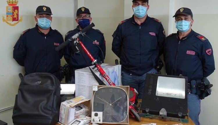 In suo possesso, all’interno di un marsupio di pelle nera che portava a tracolla, sono stati recuperati due torce ed un coltellino a serramanico, e nella sacca poggiata sul monopattino un’ingente refurtiva probabilmente rubata nelle ore precedenti da altre auto parcheggiate sempre in quella zona che, come poi accertato dai polizotti, presentavano uno dei finestrini infranti.
