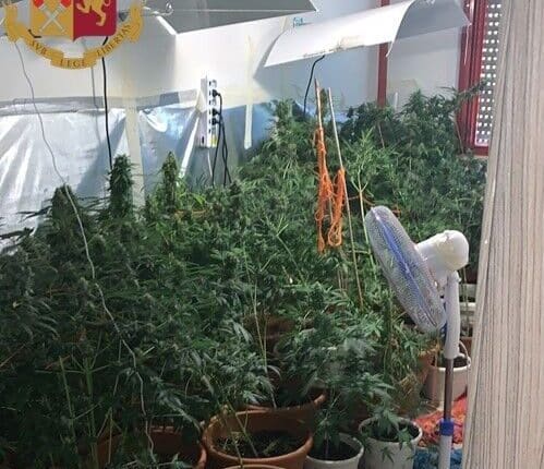 Nella successiva perquisizione degli ambienti della casa, in una stanza è stata scoperta una vera e propria serra adibita alla coltivazione ed alla produzione della marijuana, allestita con tre grosse lampade alogene posizionate al di sopra di circa 40 piantine dell’altezza media di circa un metro e venti l’una, due rilevatori di umidità e quattro ventilatori usati per areare la stanza.