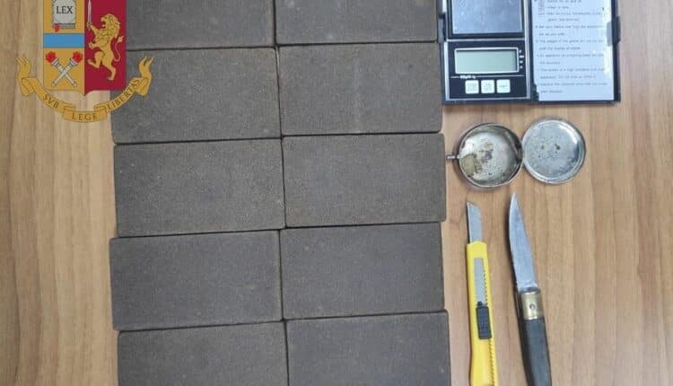 Bloccato il 53enne, i poliziotti hanno recuperato l’involucro ritrovando al suo interno 10 panetti di hashish da circa 100 grammi l’uno.