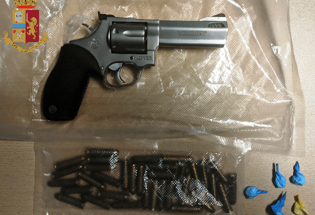 Durante il controllo il conducente dell’auto, un italiano di 26 anni, viene trovato in possesso di alcuni ovuli di stupefacente. La droga era occultata negli slip. Il rinvenimento dello stupefacente fa scattare la perquisizione domiciliare a casa del ventiseienne. Qui gli agenti trovano in uno zainetto una pistola Taurus 357 Magnum, completa di 34 cartucce, che risulta provento di furto avvenuto nel 2014.