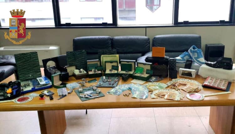 Inoltre, gli operatori hanno effettuato un controllo in via Pietro Germi presso l’abitazione dell’uomo dove hanno trovato 148 cartucce calibro 9 a salve, 10 cartucce da fucile calibro 12, 17 orologi di cui 16 contraffatti e uno autentico, una garanzia in pergamena di un noto marchio di orologeria, 5 buste di carta per il confezionamento riportanti lo stesso marchio, 3 cinturini in acciaio e 4 scatole di note “griffe” di alta orologeria, un kit contenenti un trapano professionale per incisioni, ricambi, mini punte da lavoro, utensili per riparazioni di orologi, un telefono cellulare ancora confezionato, 6426 euro, tre pochette e due paia di scarpe contraffatte di note case di moda.