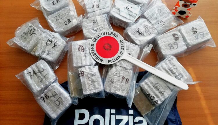 Giunti sul posto, da subito sono stati colpiti dall’evidente stato di nervosismo del cittadino appena fermato, che annovera numerosi precedenti per spaccio di droga e che non ha saputo fornire una valida spiegazione del perché fosse in transito in questa provincia. Pertanto, si è proceduto ad effettuare un approfondito controllo dell’auto a bordo della quale viaggiava l’uomo, un’Opel Astra grigia, rinvenendo nel portabagagli, occultato sotto vari indumenti, un grosso involucro in cellophane trasparente, contenente 10 panetti avvolti da nastro isolante marrone, ognuno dei quali a sua volta suddiviso in 5 (cinque) parallelepipedi di sostanza pastosa di colore marrone, risultata essere Hashish dal peso complessivo di circa 10 KG.
