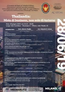 Il 28 giugno 2019 alla Sala Consiliare del Municipio 5 di Milano, con il patrocinio dell’Assessorato al commercio, la presenza del Console onorario dott. Virgilio e di un funzionario di Thai Trade (l’ente per il commercio Thailandese) si parlerà delle opportunità di business in Thailandia.