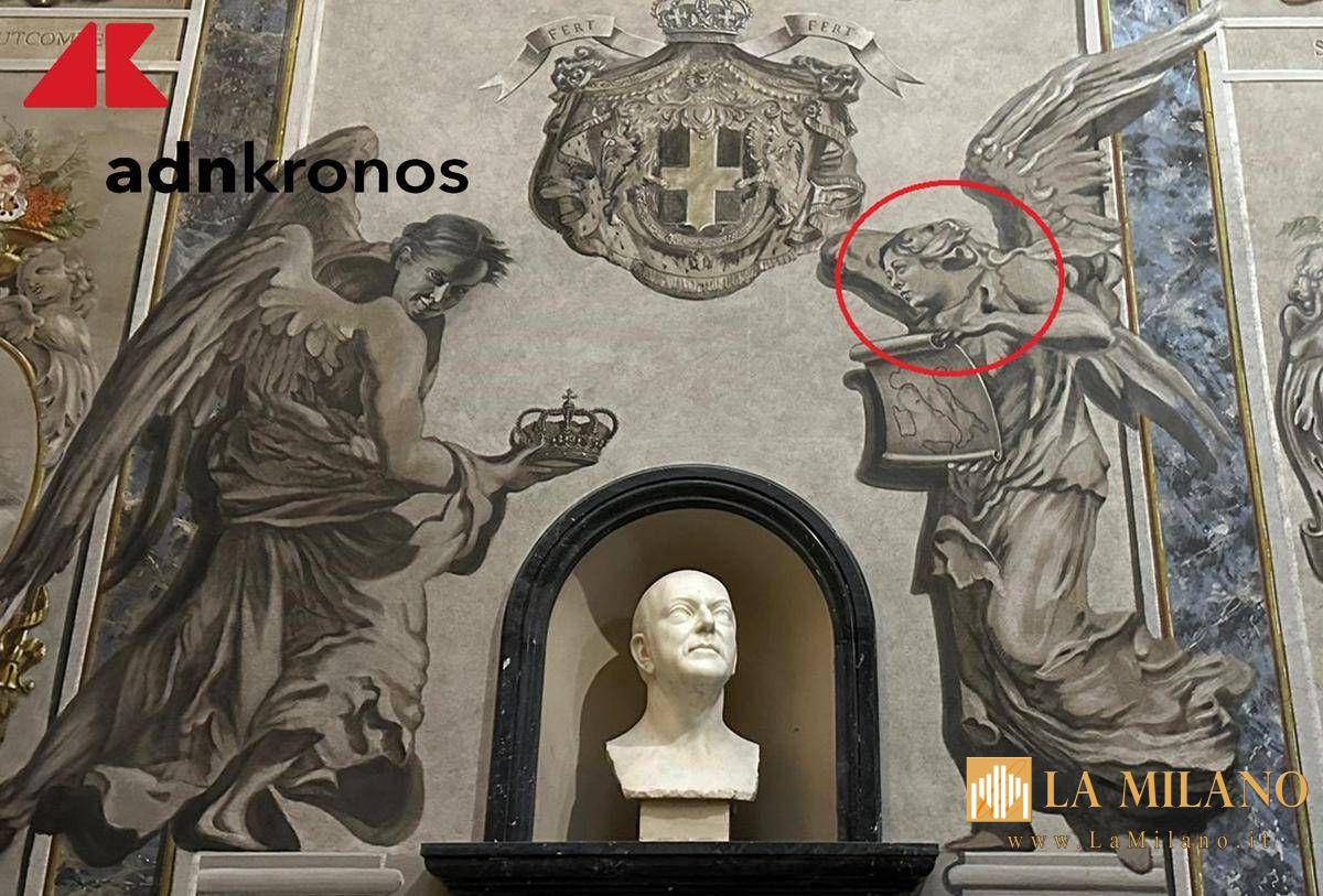 Un angelo con il volto di Giorgia Meloni, in una basilica in pieno centro a Roma: a San Lorenzo in Lucina, dove è in corso un importante restauro, il volto della premier è apparso in una cappella della basilica, vicino alla sagrestia: su un muro, con al centro il busto di Umberto II, l’angelo di sinistra tiene in mano la corona reale, mentre l’angelo di destra, con un volto che assomiglia a quello del presidente del Consiglio, tiene fra le mani una pergamena, su cui è raffigurata l’Italia: “La vollero i monarchici”, racconta monsignor Daniele Micheletti, responsabile della basilica.