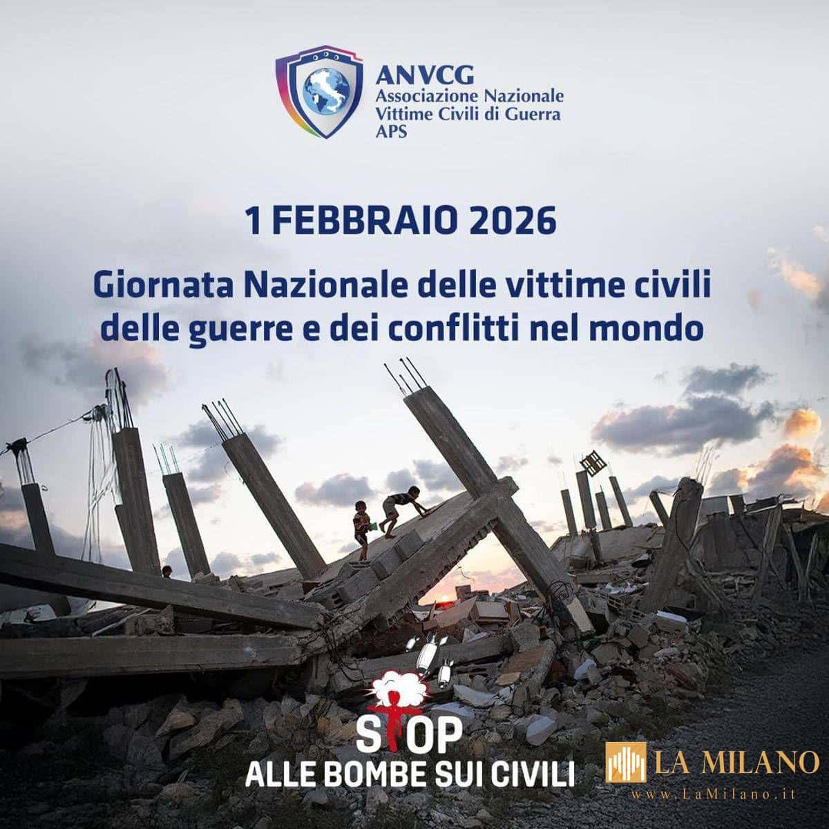 Il 1 febbraio si celebra la Giornata Nazionale delle vittime civili delle guerre e dei conflitti nel mondo, istituita all’unanimità dal Parlamento con la legge 9 del 25 gennaio 2017. La ricorrenza nasce con un duplice obiettivo: commemorare le vittime civili di tutte le guerre ed informare e sensibilizzare sull’impatto devastante che i conflitti in corso nel mondo hanno sulle popolazioni civili coinvolte. Grazie al protocollo di intesa siglato tra l’Anvcg e l’Anci nel 2022, e che è stato rinnovato per altri quattro anni dal Presidente Nazionale dell’Anvcg Michele Vigne e dal presidente dell’Anci Gaetano Manfredi proprio per l’edizione della Giornata Nazionale di quest’anno, nella serata del 1 febbraio centinaia di Comuni italiani aderiranno alla Giornata illuminando di blu i Municipi ed esponendo lo striscione Stop alle bombe sui civili.