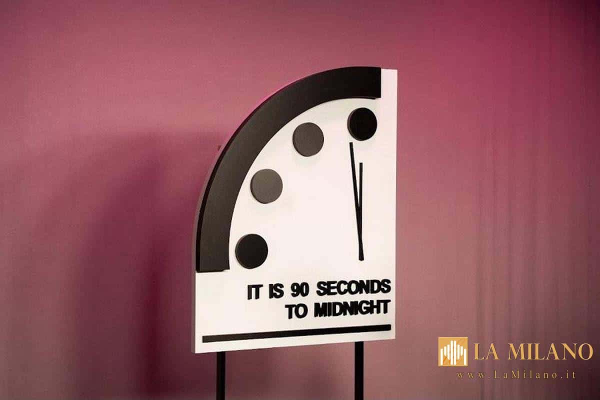L’orologio dell’Apocalisse più vicino che mai alla mezzanotte. Il Doomsday Clock, indicatore del Bulletin of the Atomic Scientists (“Bollettino degli scienziati atomici”) che rappresenta quanto l’umanità sia vicina alla catastrofe, si è avvicinato più che mai alla mezzanotte, a causa delle preoccupazioni relative alle armi nucleari, al cambiamento climatico e alla disinformazione.