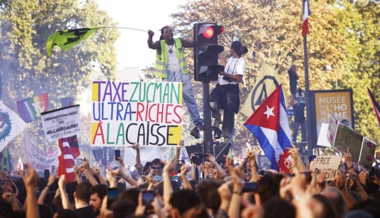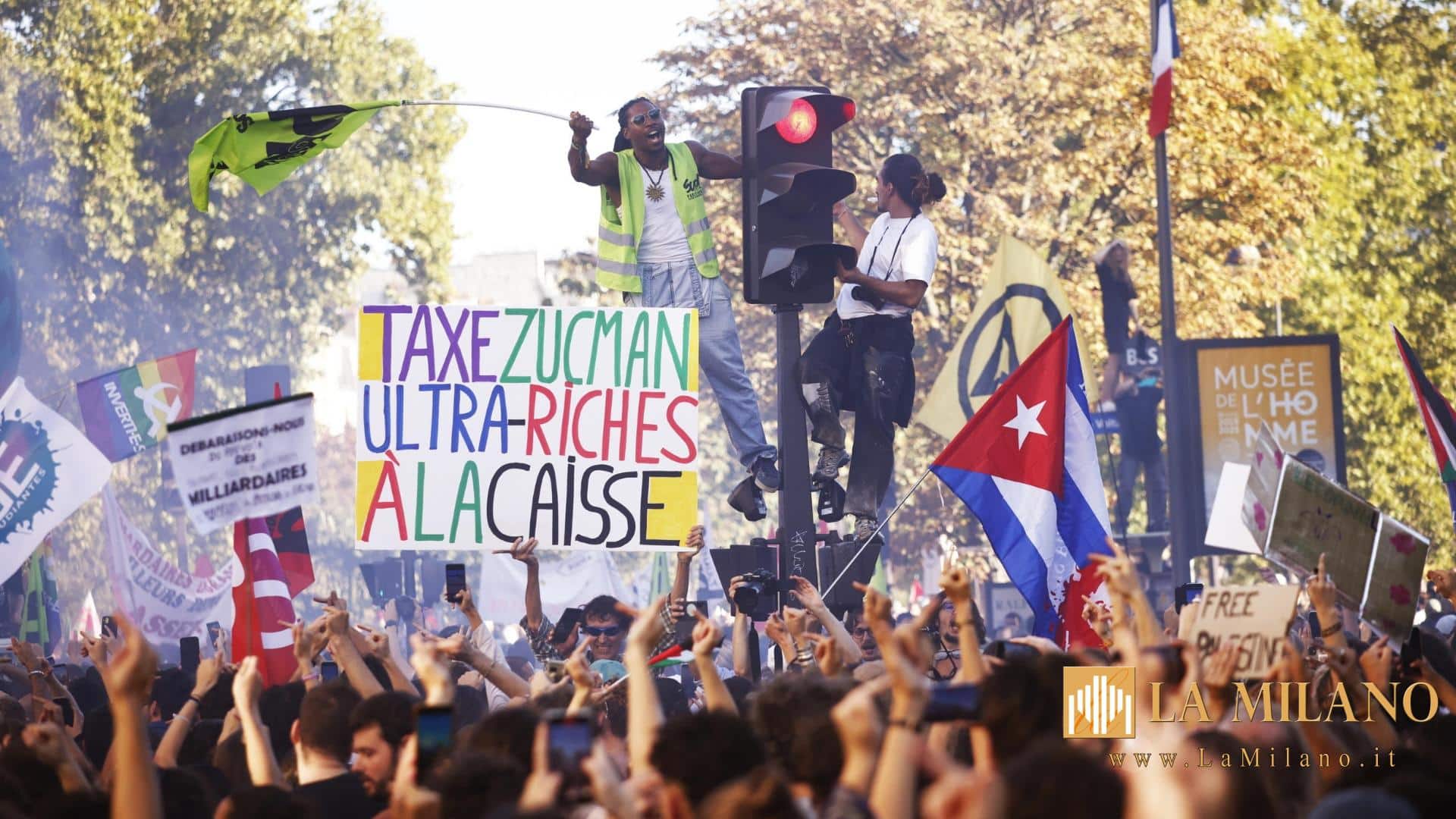 “Tassa Zucman sugli ultra-ricchi” reclama un manifesto, riferendosi alla proposta di una tassa minima globale sui patrimoni dei miliardari avanzata dall’economista francese e non ancora adottata in Francia.