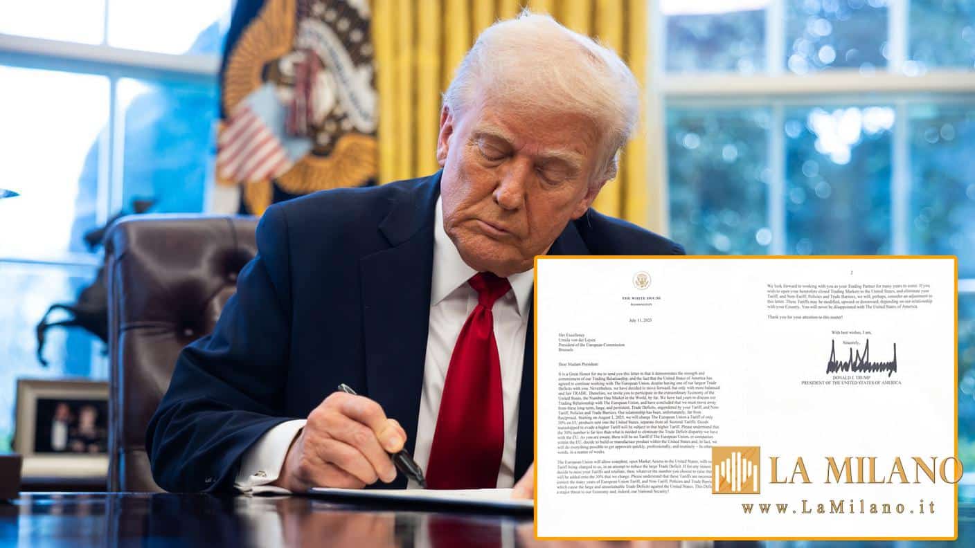 Pertanto, vi invitiamo a partecipare alla straordinaria economia degli Stati Uniti, di gran lunga il mercato numero uno al mondo. Abbiamo avuto anni per discutere delle nostre relazioni commerciali con l’Unione Europea e abbiamo concluso che dobbiamo abbandonare questi deficit commerciali a lungo termine, ampi e persistenti, generati dalle vostre politiche tariffarie e non tariffarie e dalle vostre barriere commerciali. Le nostre relazioni sono state, purtroppo, tutt’altro che reciproche. A partire dall’1 agosto 2025, applicheremo all’Unione Europea una tariffa di solo il 30% sui prodotti Ue spediti negli Stati Uniti, distinta da tutte le tariffe settoriali. Le merci trasbordate per eludere una tariffa doganale più elevata saranno soggette a tale tariffa doganale più elevata. Vi preghiamo di comprendere che il 30% è di gran lunga inferiore a quanto necessario per eliminare il divario di deficit commerciale che abbiamo con l’Ue. Come sapete, non ci saranno tariffe doganali se l’Unione Europea, o le aziende all’interno dell’Ue, decideranno di costruire o produrre prodotti negli Stati Uniti e, di fatto, faremo tutto il possibile per ottenere le autorizzazioni rapidamente, professionalmente e regolarmente – in altre parole, nel giro di poche settimane. L’Unione Europea consentirà un accesso completo e aperto al mercato degli Stati Uniti, senza che ci vengano addebitate tariffe doganali, nel tentativo di ridurre l’elevato deficit commerciale. Se per qualsiasi motivo decidete di aumentare le vostre tariffe e di reagire, l’importo, qualunque sia l’aumento scelto, verrà aggiunto al 30% che applichiamo. Vi preghiamo di comprendere che queste tariffe sono necessarie per correggere i molti anni di politiche tariffarie e non tariffarie e barriere commerciali dell’Unione Europea che causano gli ingenti e insostenibili deficit commerciali a carico degli Stati Uniti. Questo deficit rappresenta una grave minaccia per la nostra economia e, di fatto, per la nostra sicurezza nazionale! Non vediamo l’ora di collaborare con voi come vostro partner commerciale per molti anni a venire. Se desiderate aprire i vostri mercati commerciali, finora chiusi, agli Stati Uniti ed eliminare le vostre politiche tariffarie e non tariffarie e le barriere commerciali, potremmo valutare una modifica a questa lettera. Queste tariffe potrebbero essere modificate, al rialzo o al ribasso, a seconda del nostro rapporto con il vostro Paese. Non rimarrete mai delusi dagli Stati Uniti d’America. Grazie per l’attenzione a questa questione. Con i migliori auguri, Donald J. Trump”.