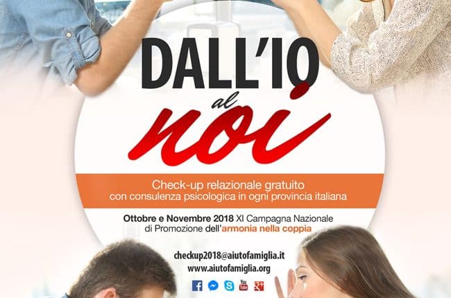 AAF – Associazione Aiuto Famiglia Onlus annuncia l’inizio della XI campagna nazionale di promozione dell’armonia di coppia “Dall’io al noi”. A partire da lunedì 1 ottobre e fino alla fine di novembre le coppie avranno la possibilità di conoscersi meglio e fare una sorta di “controllo” su quello che è il loro rapporto, beneficiando altresì di una consulenza psicologica gratuita.