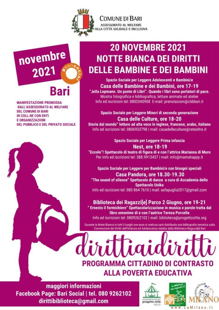 La “Notte Bianca dei diritti delle bambine e dei bambini, delle ragazze e dei ragazzi” si inserisce nel più ampio programma “Diritti ai Diritti” promossa dall’assessorato al Welfare del Comune di Bari e curato dalla Biblioteca dei Ragazzi[e] gestita dalla coop. Soc. Progetto Città.