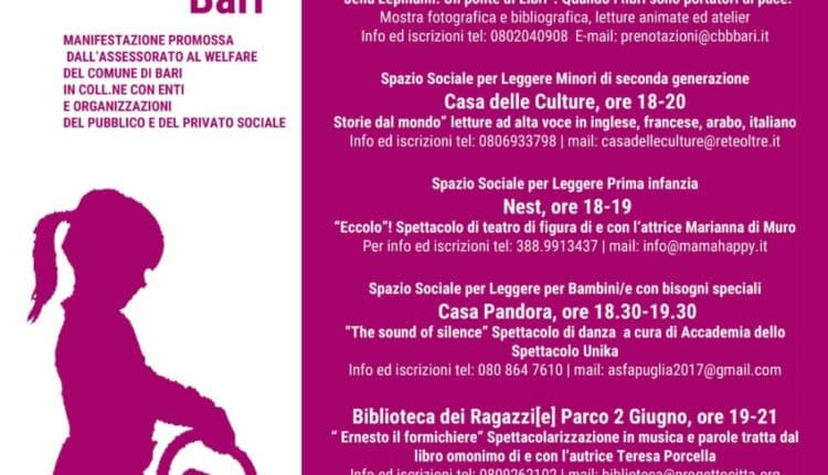 Mentre nello Spazio sociale per Leggere dedicato ai bambini con bisogni speciali, presso la Casa Pandora in via Napoli 391, dalle ore 18 avrà luogo “The sound of silence”, uno spettacolo di danza a cura dell’Accademia dello Spettacolo Unika (per informazioni e iscrizioni 080 8647610 e asfapuglia2017@gmail.com).