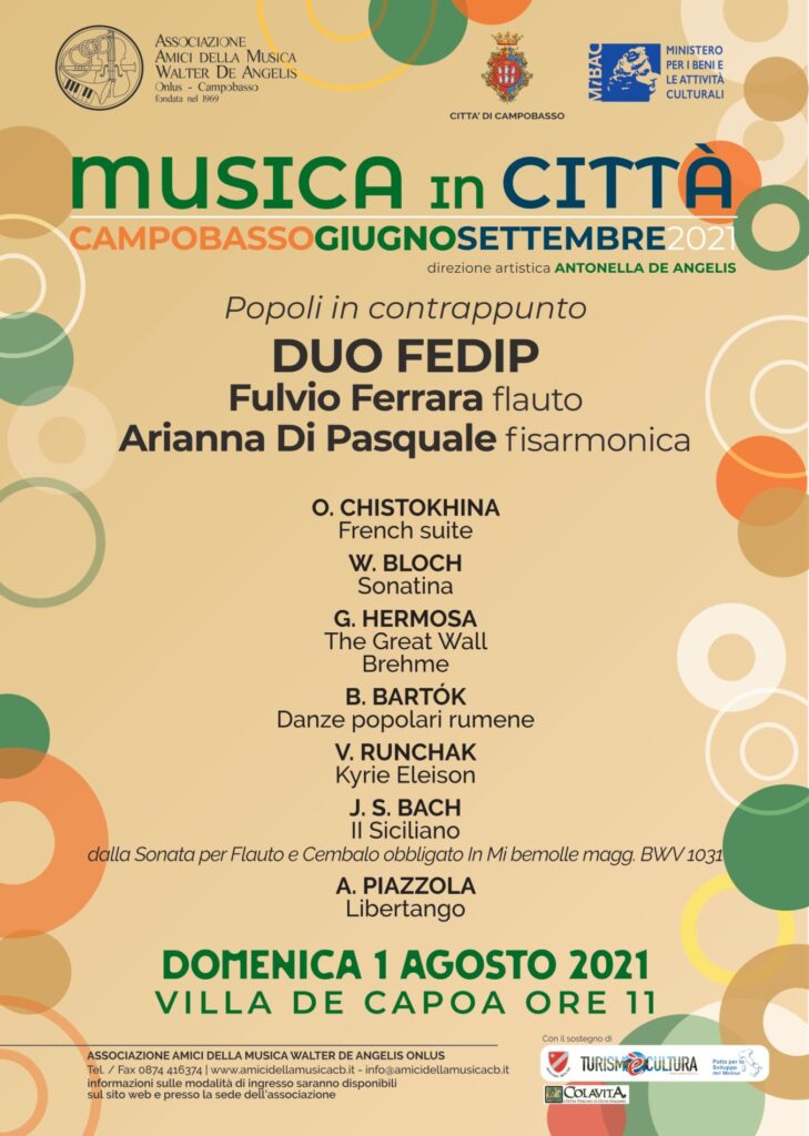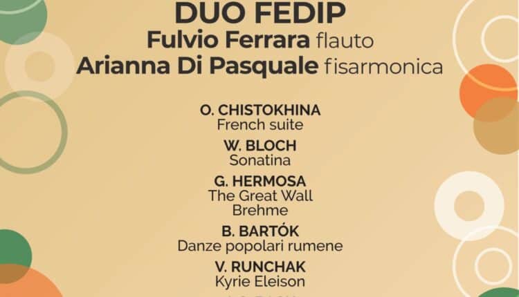 Campobasso, Fulvio Ferrara, al flauto, e Arianna Di Pasquale, fisarmonica, proporranno un programma con musiche di Chistokhina, Bloch, Solotarev, Hermosa, Bartok, Runchak, Bach, Piazzola.