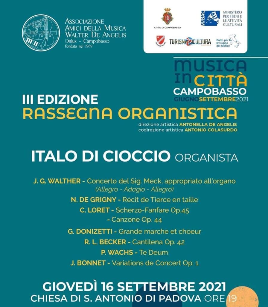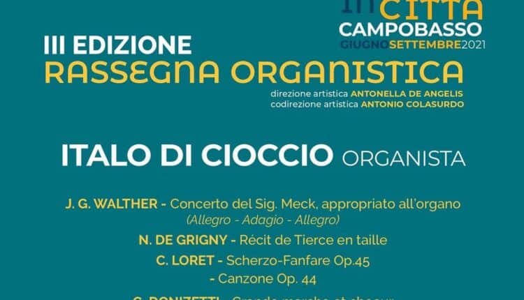 Campobasso, parte giovedì 16 settembre, nella Chiesa di Sant’Antonio di Padova, alle ore 19.00, la Rassegna Organistica 2021 organizzata dall’Associazione Amici della Musica Walter De Angelis e inserita nel calendario degli eventi di “Settembre in Città”, approntato dall’assessorato alla Cultura del Comune di Campobasso.