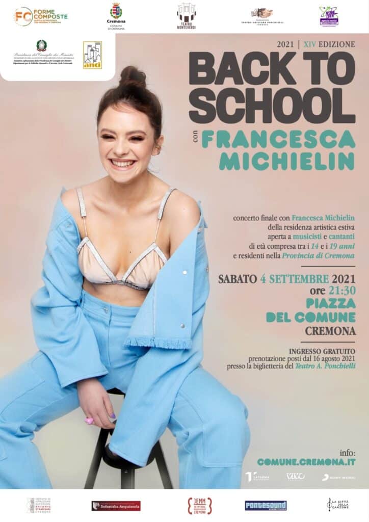 Cremona, Gaia Volpe, batteria, Zoe Evelina Acerbi, basso, Riccardo Riboni, chitarra, Diego Gennari, chitarra, Nicola Casagrande, chitarra e voce, Giulia Libretti, piano e voce, Gabriela Condulet, voce, Greta Ommeniello, voce, Emma Marchetti, voce, Lucia Cominelli, voce. Sono questi i nomi dei dieci giovani musicisti che, al termine delle audizioni, sono stati ammessi per l’edizione 2021 di Back to School, iniziativa promossa dal Teatro Monteverdi del Comune di Cremona che quest’anno si colloca nell’ambito del progetto Forme Composte: Musica in residenza tra Modena e Cremona in gemellaggio con il Comune di Modena e finanziato da ANCI Nazionale, per una residenza artistica che vede come ospite la cantautrice Francesca Michielin.