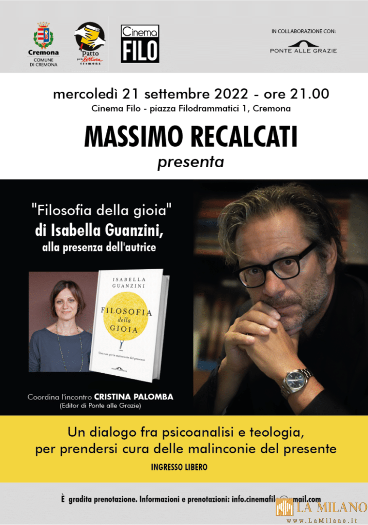 Una nuova iniziativa di promozione della lettura. Organizzato dal Comune di Cremona, nell’ambito del Patto per la Lettura, con la collaborazione del Cinema Filo e della casa editrice Ponte alle Grazie, appuntamento mercoledì 21 settembre, alle ore 21,00, al Cinema Filo (piazza Filodrammatici, 1), con Massimo Recalcati che presenterà il libro Filosofia della gioia di Isabella Guanzini, presente l’autrice.