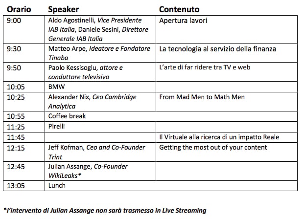 Main focus dell’edizione 2017 sarà l’attesissimo intervento di Julian Assange, celebre giornalista e co-fondatore di WikiLeaks, che in collegamento video porterà la sue esperienza sulla diffusione dei contenuti online e sulla tutela della privacy dei dati. Altri ospiti internazionali come Claire Enders (Founder Enders Analysis) Alexander Nix (Ceo Cambridge Analytica), Jeff Kofman (CEO & Co-Founder Trint), Alec McCrindle (Director of Creative and Innovation for RYOT Studio), si confronteranno sul presente e sul futuro del mondo digitale, dando vita ad approfondimenti e spunti di riflessione su trend di mercato, insight creativi, demo di  Virtual reality, Augmented Reality e Artificial intelligence.