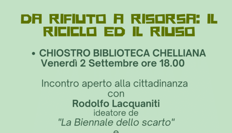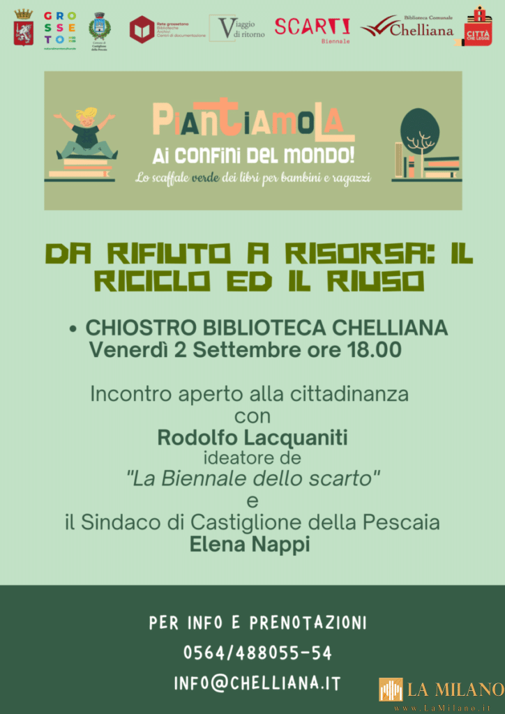 Da qui si è preso lo spunto di organizzare tre appuntamenti importanti dal titolo “Da rifiuto a risorsa: il riciclo ed il riuso”: il primo si svolgerà a Grosseto, nel chiostro della Biblioteca Comunale Chelliana, venerdì 2 settembre alle ore 18:00 e consisterà in un incontro sul tema scelto, rivolto a tutta la popolazione, tra Rodolfo Lacquaniti e il Sindaco di Castiglione della Pescaia.